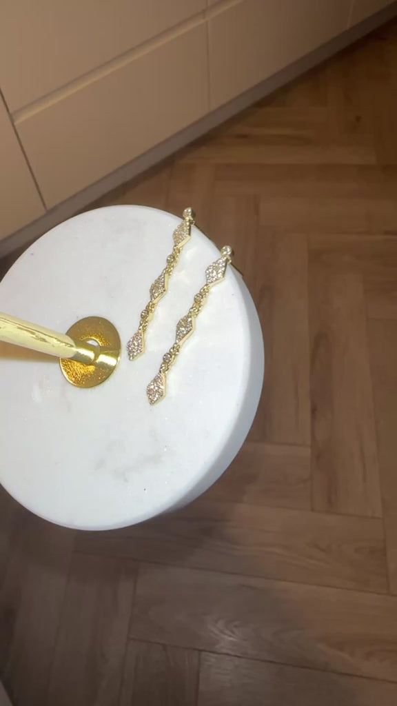 Gerda Øreringe er et par elegante hængeøreringe med et let og eksklusivt udtryk. De små, glitrende zirconkrystaller er indgraveret i de fine led, så du får et diskret spil i lyset, der passer både til hverdag og når du skal være lidt mere pyntet.