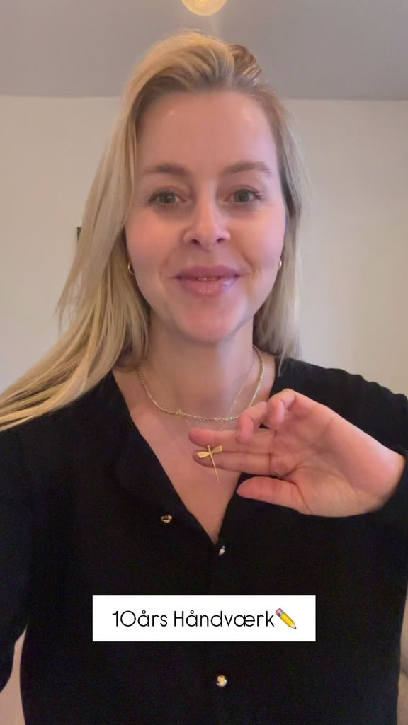 Kæden kan justeres fra 42 til 47 cm, så du nemt kan tilpasse den til både skjorte, strik, top og kjole. Brug den tættere på halsen for et rent, minimalistisk udtryk, eller en anelse længere for et blødere fald.